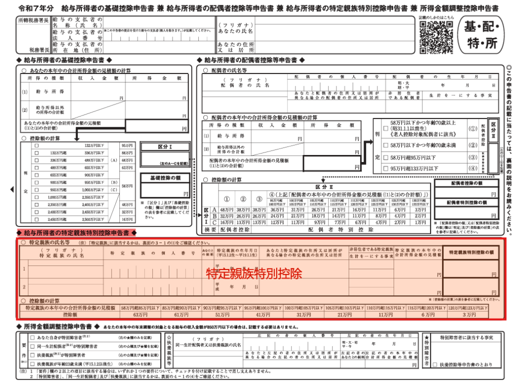 特定親族特別控除を受ける場合、以下の「給与所得者の特定親族特別控除申告書」に記入します。