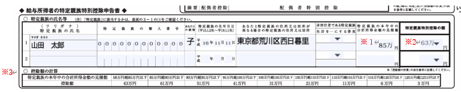 下記「給与所得者の特定親族特別控除申告書」の記入例になります。